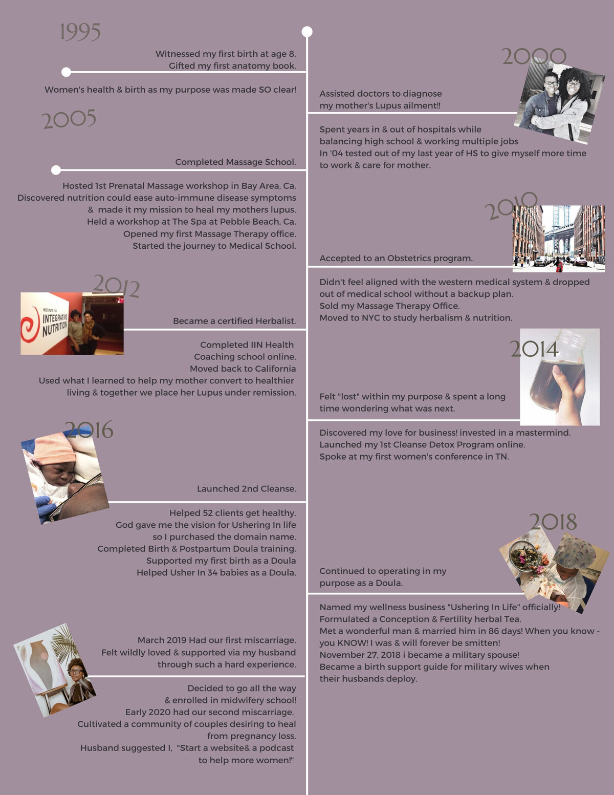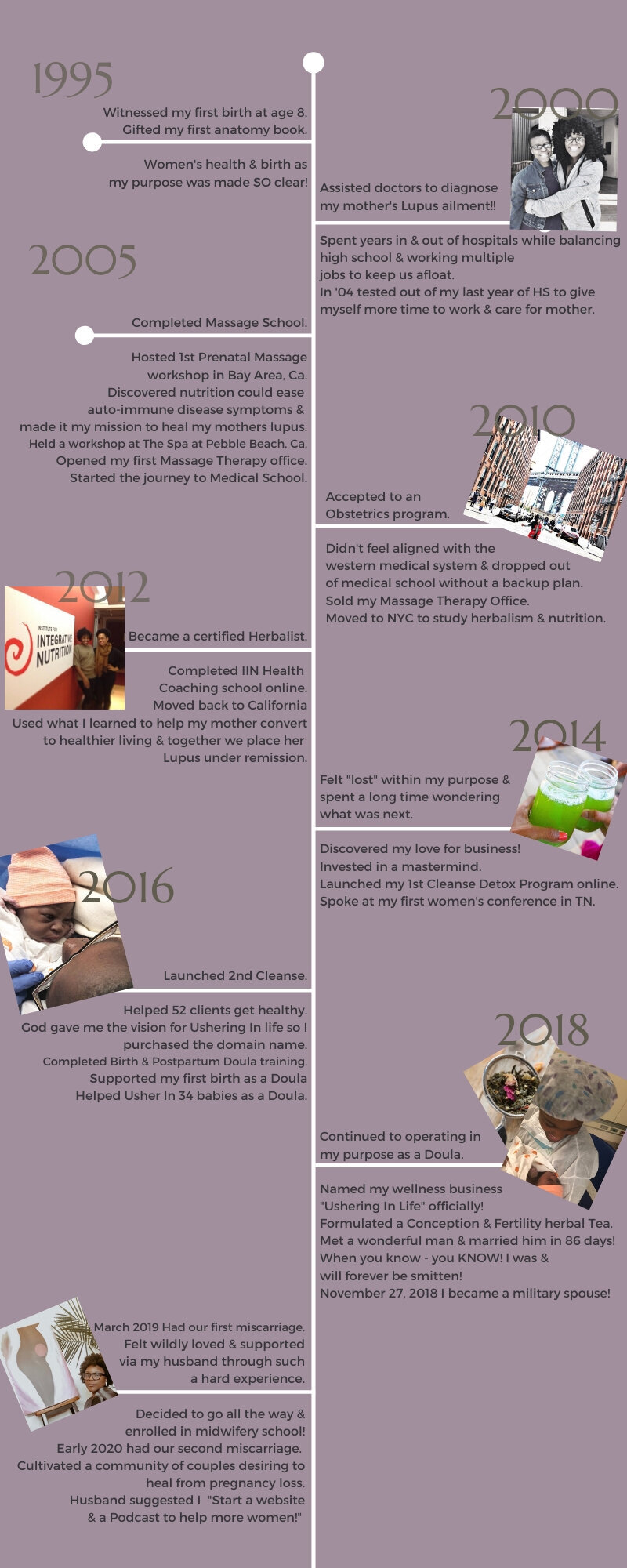 Called to serve the world as an advocate for women's wellness, especially throughout every phase of birth is what I consider to be my life's work. I attended my DONA International Birth and Postpartum Doula training in May of 2016, but my path to women's care and birth work really started 24 years ago when I witnessed the birth of my niece. It was transformative and the moment I realized how our bodies are created to expand, usher in life, heal themselves and nurture. Over the years my path has taken intentional routes ensuring my technique and approach to care is skilled, mindful, well cultured and uniquely diverse. Starting with the practice of Massage Therapy-prenatal massage focused. Combined with love for Holistic Nutrition and Life coaching, Healing herbal remedies and more!